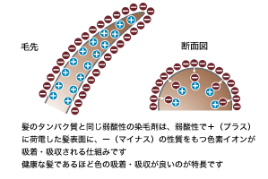 ベルジュバンス弱酸性美容法のヘアカラー(メーキングカラー)は、色素をイオンが引き合う作用(電気の性質)を利用して、キューティクルにしっかりと吸着吸収させる方法です。